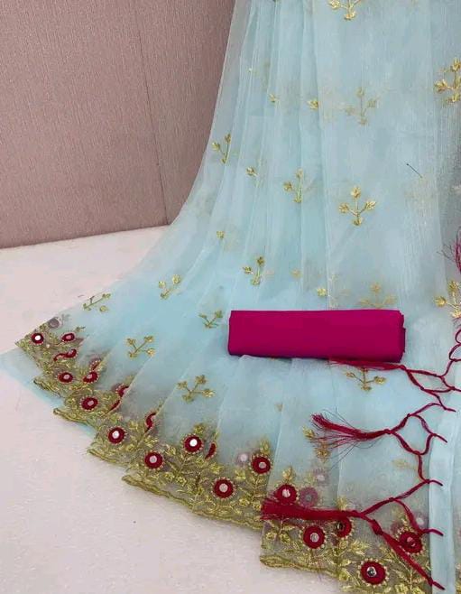 very beautiful super net fabric embroidery and mirror work sari with blouse
